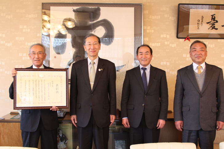 (右の写真左から、水瀧達雄副代表理事、市長、三島賢三事務局長、月森寛理事)