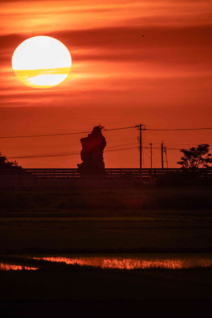 こちらは、大きな夕日が空を茜色に染めている光景が美しい一枚。