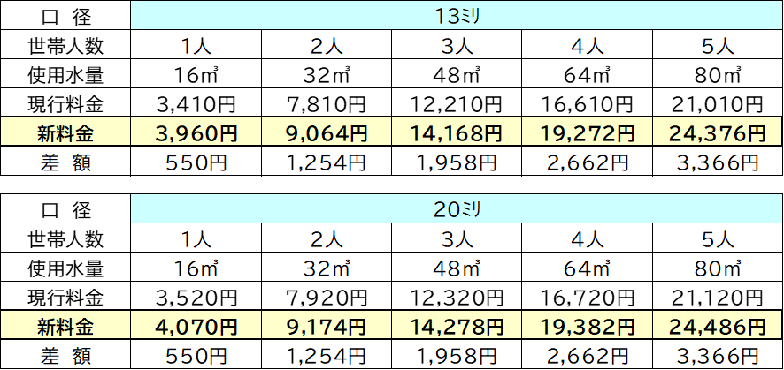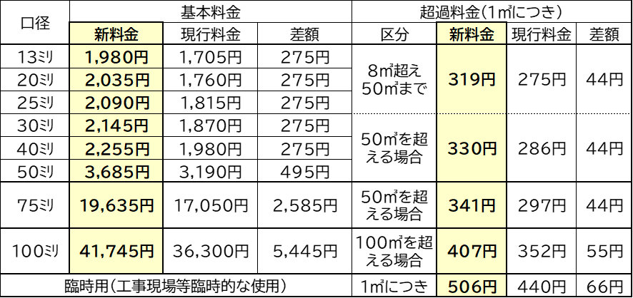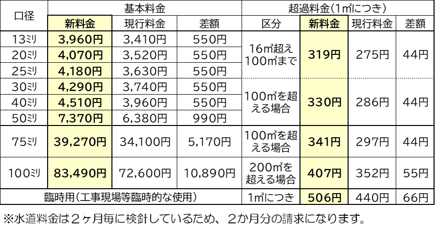 令和8年4月1日から各口径別の基本料金と超過料金を見直し、給水収益が全体で15%以上増加するよう改定をおこないます。